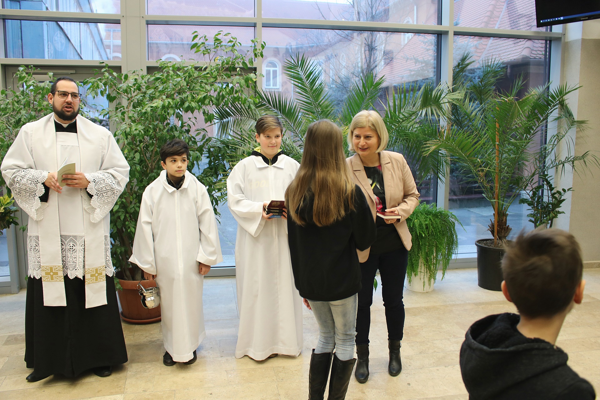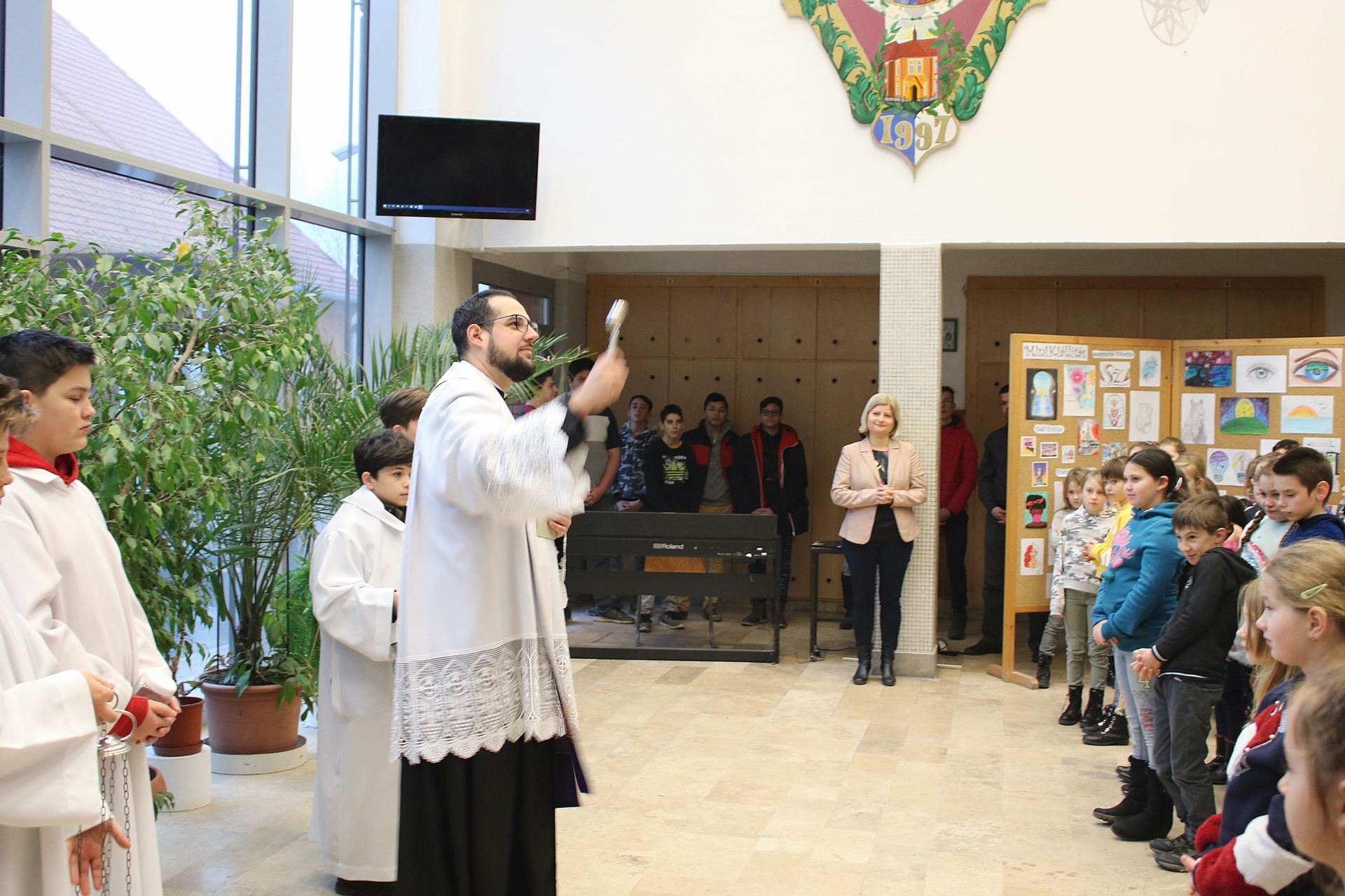 Hétfői áhítatunk elején jutalmaztok azokat a diákokat, akik rendszeresen részt vettek a rorate szentmiséken. A tárgyi jutalmak átadása után a házszentelés szertartása következett. Kértük a Mindenható Istent, hogy küldje őrző Angyalát, távozzon minden titkos kór, és a békesség lakozzon az Intézmény falai között.