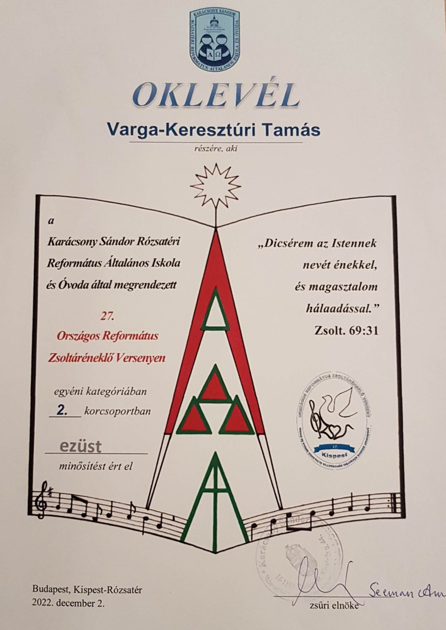 A budapesti Karácsony Sándor Rózsatéri Református Általános Iskola és Óvoda szervezésében 27. alkalommal megrendezésre kerülő Országos Református Zsoltáréneklő Versenyen 2022. dec. 2-án Varga-Keresztúri Tamás 2.b osztályos tanuló ezüst minősítést szerzett korcsoportja szóló kategóriájában.