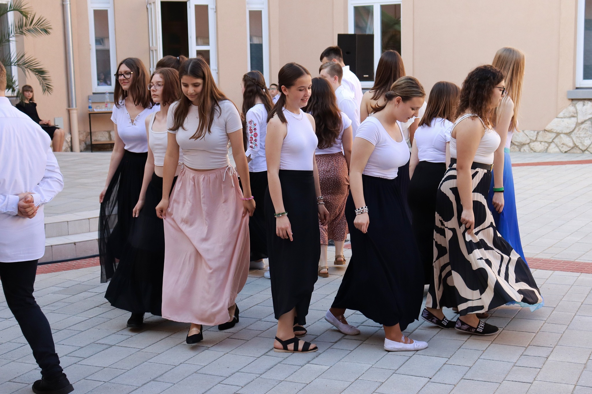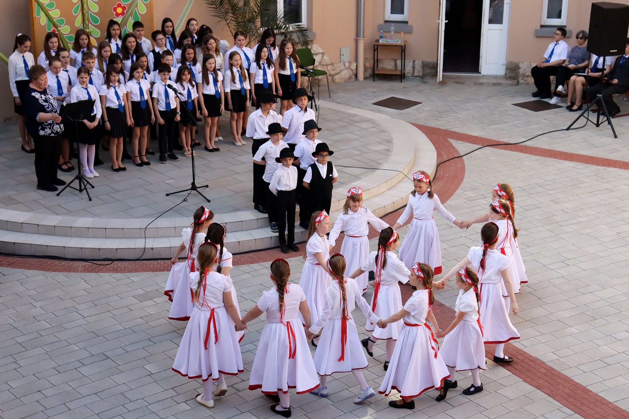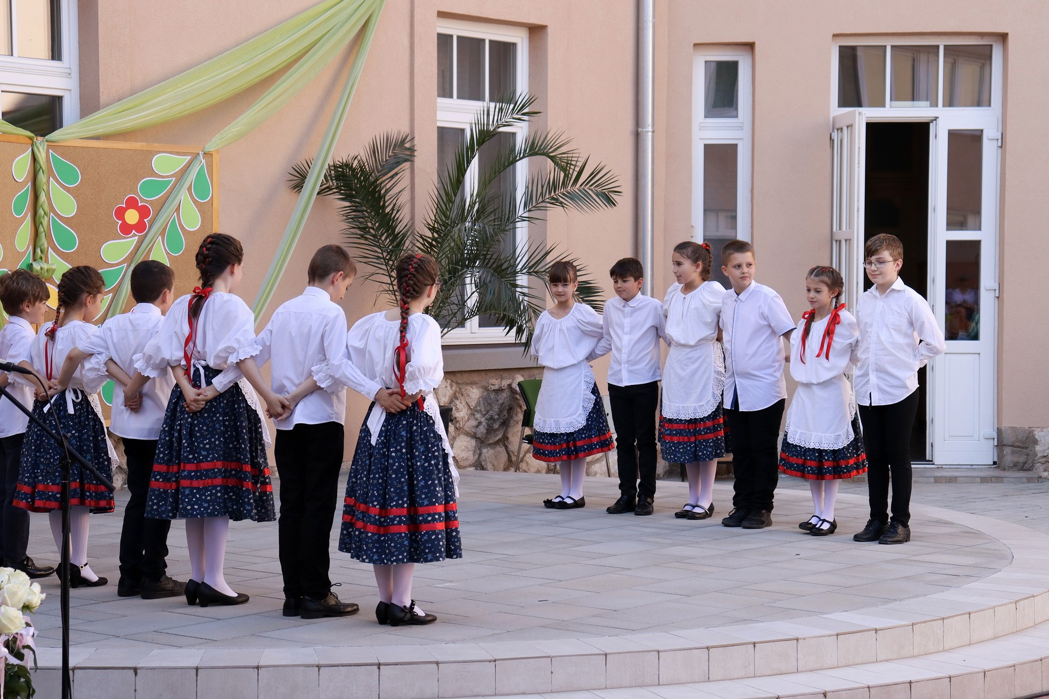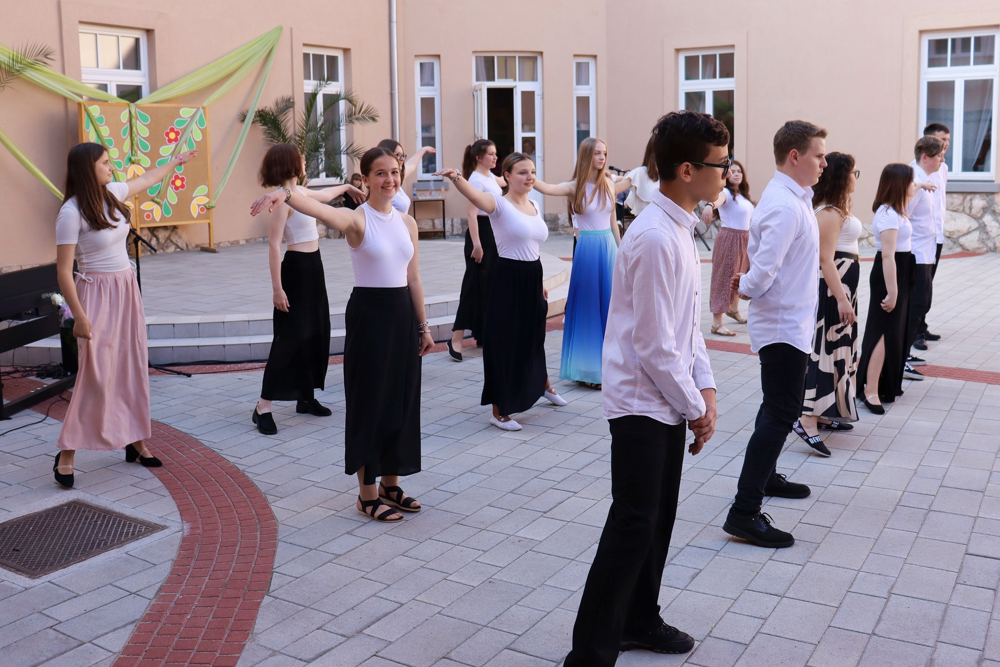 Május 24-én délután új programmal leptük meg az érdeklődőket. A hagyományteremtő Zenélő díszudvar a muzsikával kapcsolatos tehetségeket vonultatta fel iskolánkból. A vidám hangulatú előadáson felléptek a fúvós zenekar tagjai, a néptáncosok, az iskolai gyermekkórus, a kisiskolások és végzősök, továbbá egyéni hangszeresek. Az őket felkészítő pedagógusokat igazgatónő köszöntötte. A Zenélő díszudvar című programunk keretében Dózsáné Mohos Mónika igazgatónő, az általa alapított Szent Ágoston Művészeti díjat adományozta Kovács Kata 7. évfolyamos, kiemelkedően tehetséges diákunknak. Gratulálunk!