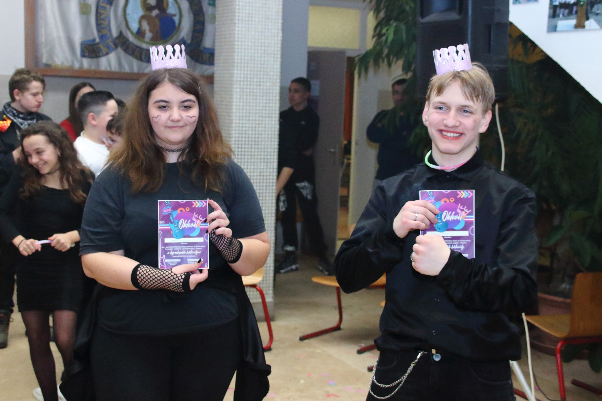 Az elmúlt pénteken a felső tagozatos diákjaink számára is megtartottuk a farsangot. A látványos, kreatív osztálytáncok után a buli a BlackTwinz-zel és az elmaradhatatlan tombolasorsolással folytatódott, ahol nagy sikert aratott az eddig megszokott főnyeremények mellett az igazgató úr suli kuponja is… Az est során a gyerekek megválasztották a legrockosabb jelmezbe bújt nyolcadikosok közül a bálkirályt (Kiss Bátor 8.b) és bálkirálynőt (Nemes Leila 8.b). Mint mindig, most is az SzMK gondoskodott a klubszendvicsekről és a parti csemegéről. Köszönjük a szülőknek a büfét, illetve minden felkészítő tanárnak és műsort adó osztálynak ezt a remek estét.