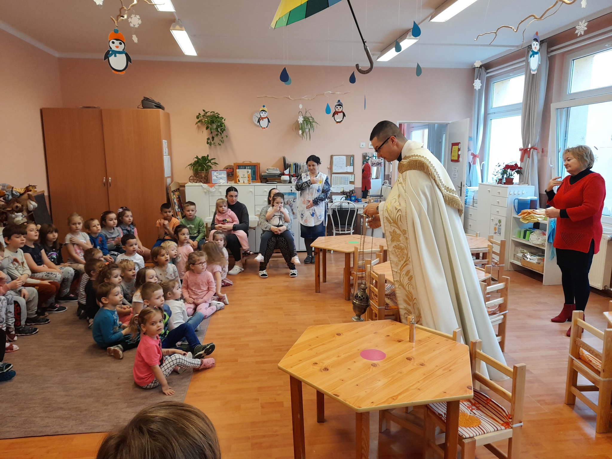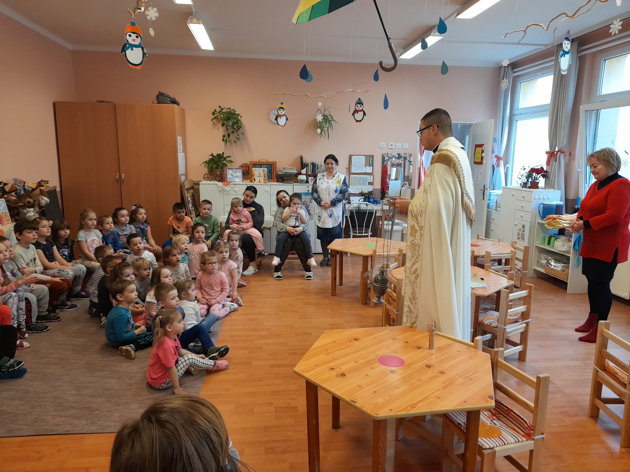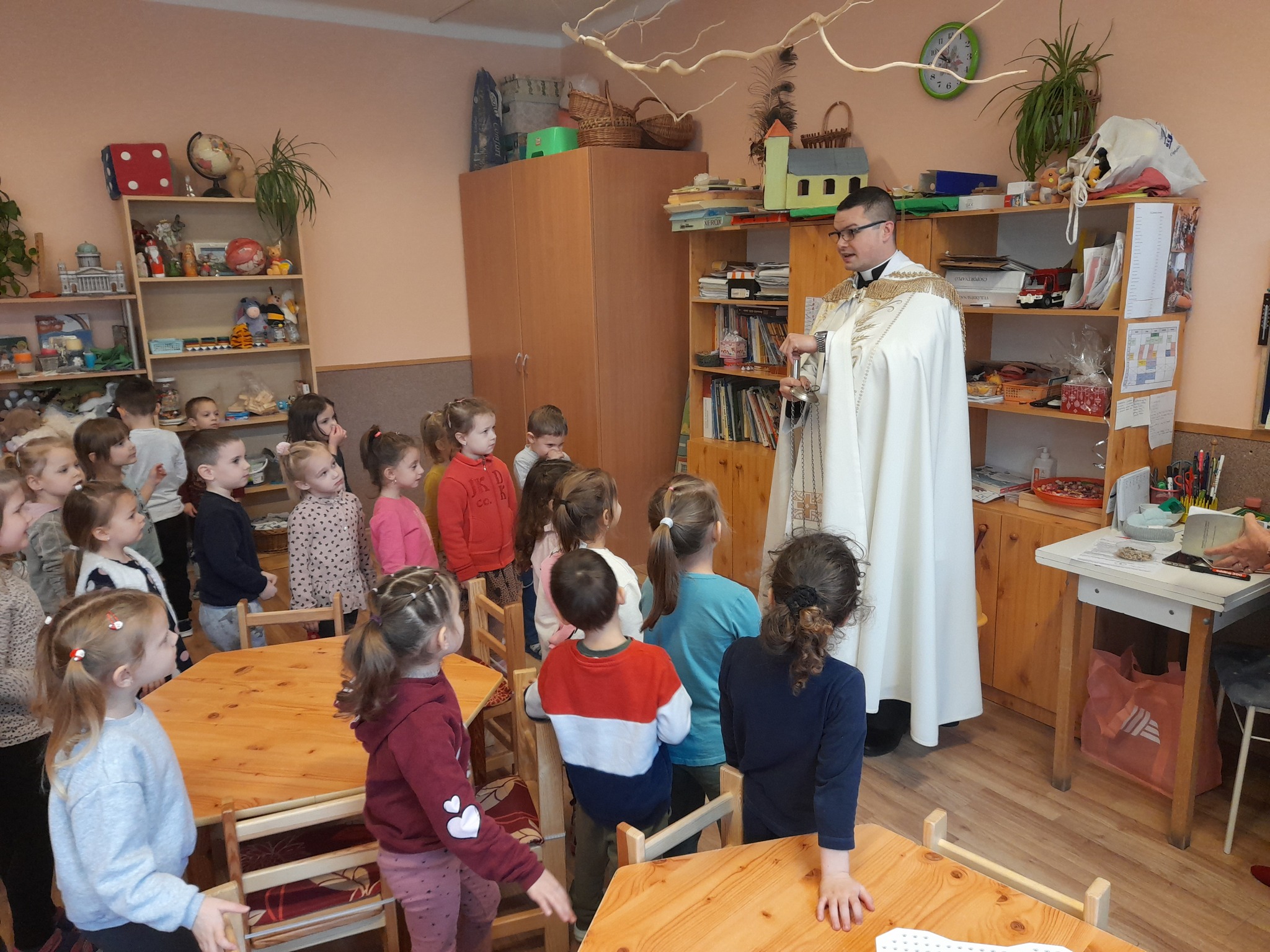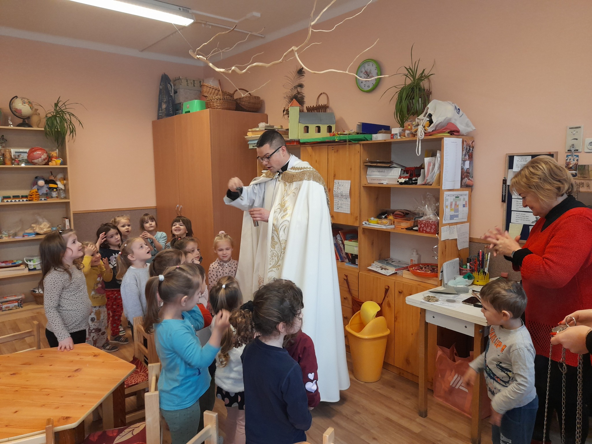 Január 13-án reggel a Halas TV forgatott óvodánkban. Délelőtt Gyirán Péter atya, óvodánk lelki vezetője a házszentelés szertartását végezte intézményünkben. Legyen áldás, békesség, szeretet gyönyörű katolikus óvodánkon! Áldás kísérje a kollégák munkáját, és minden család életét!